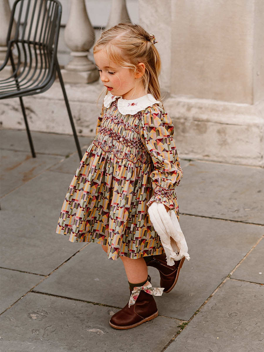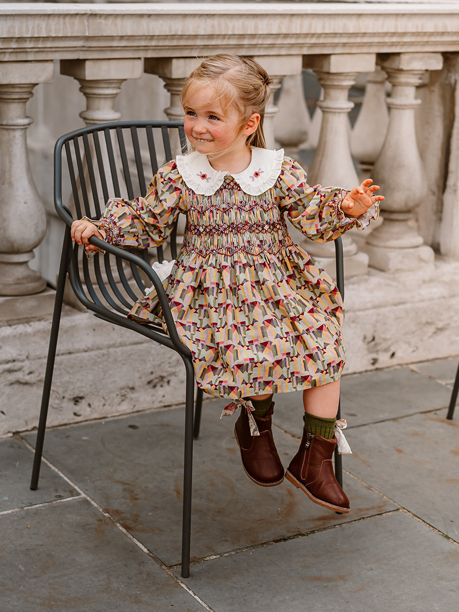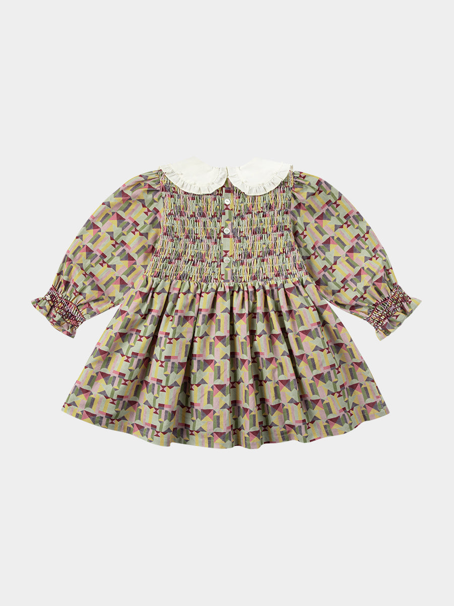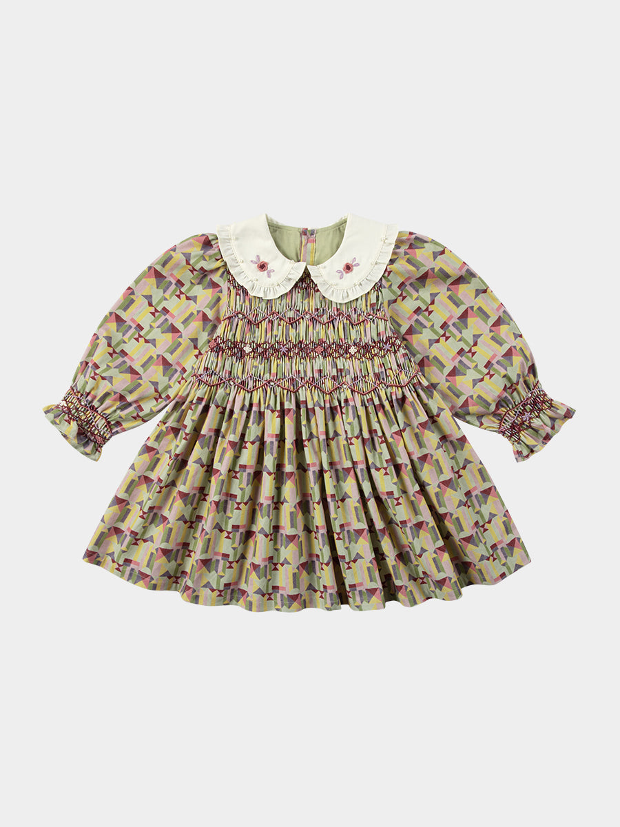 Izzy Hand-Smocking Dress, Colourful Geo, Purple