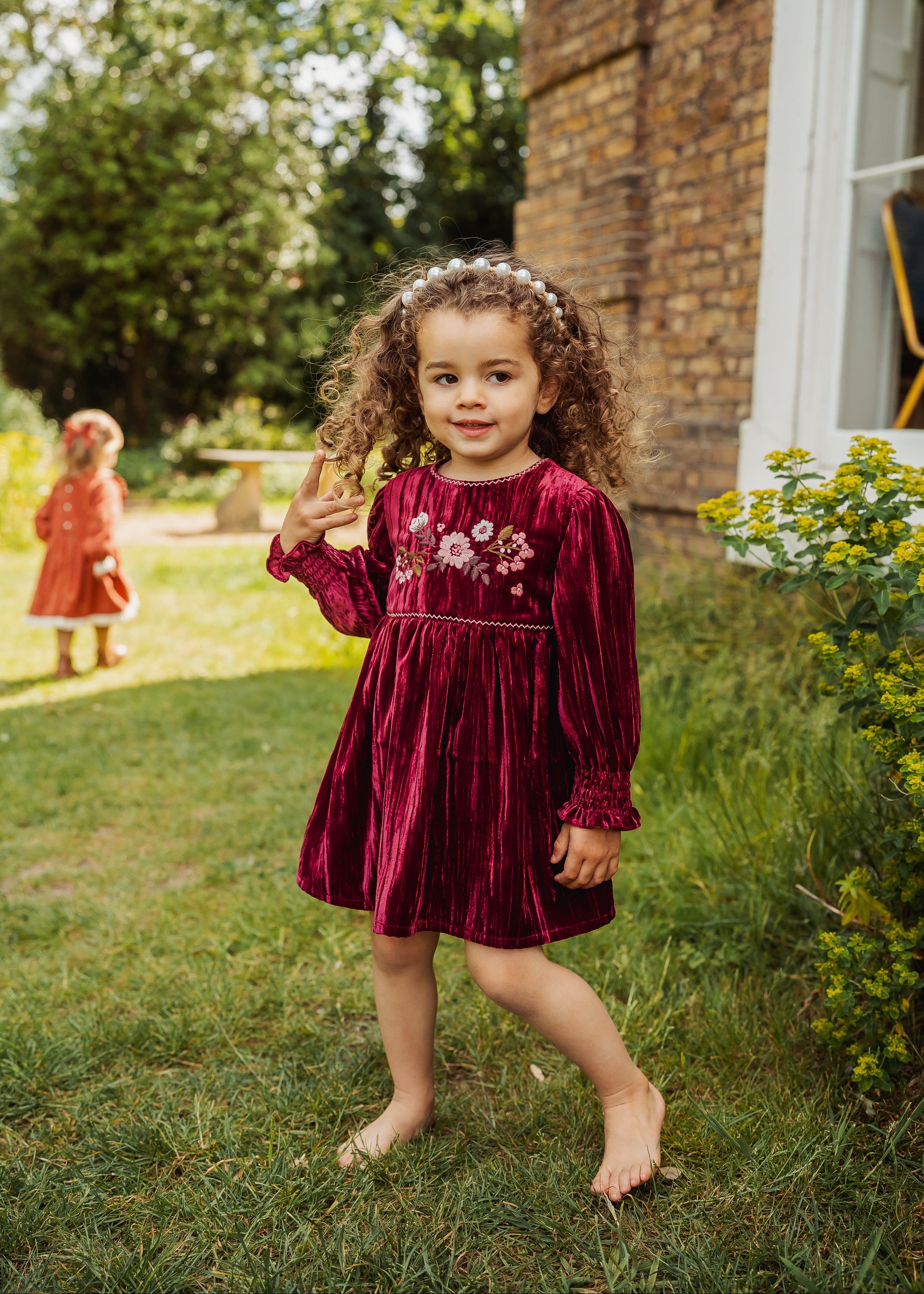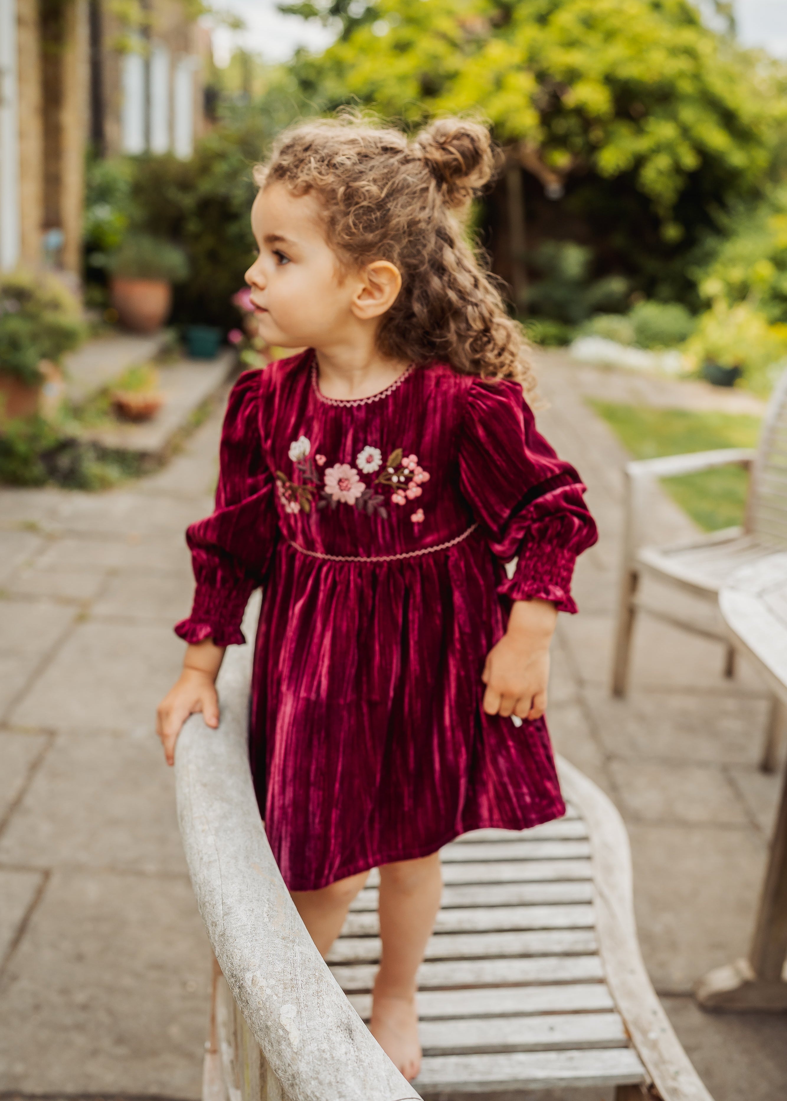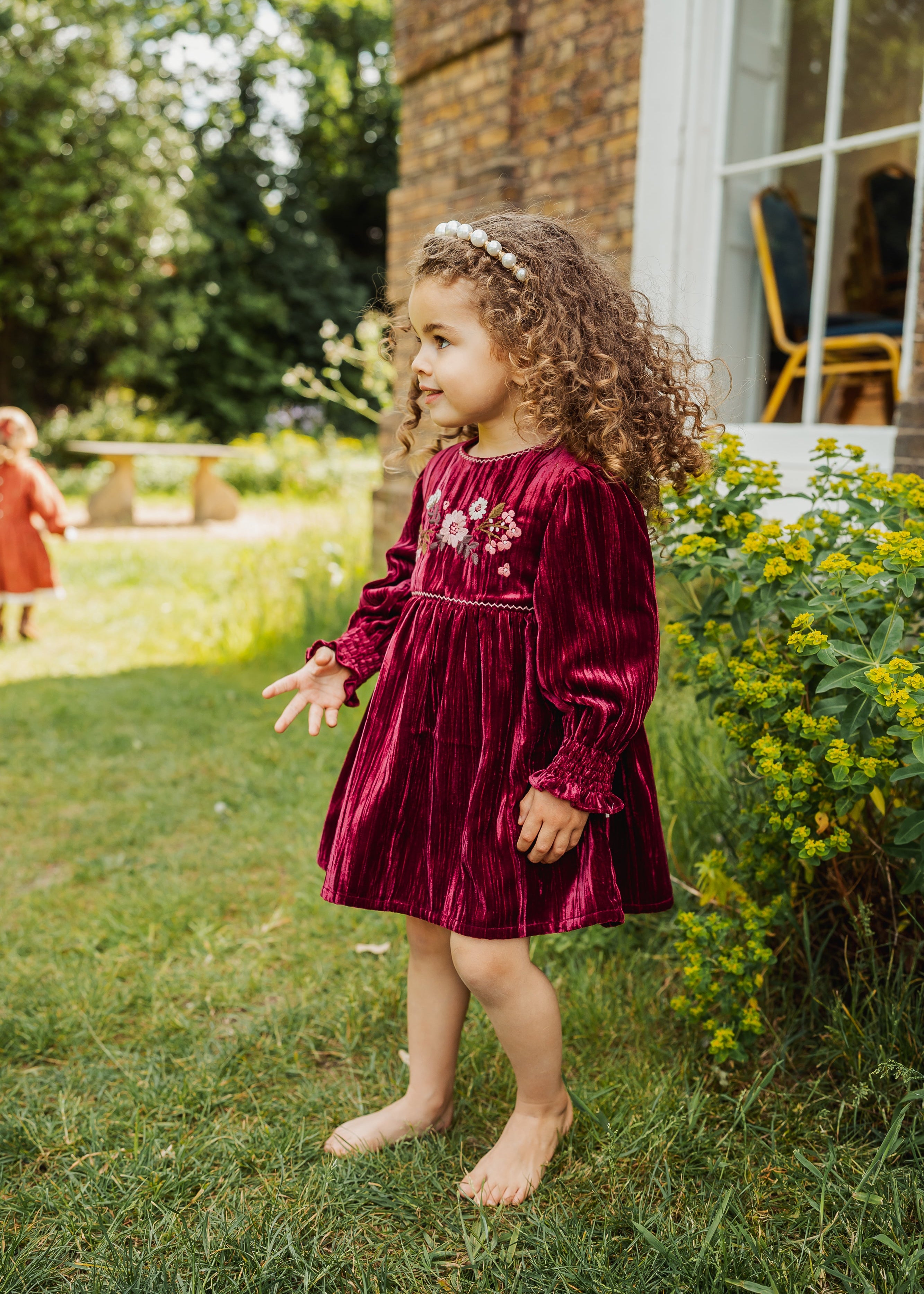 Celine Smocking Dress, Wildflower Polka, Burgundy