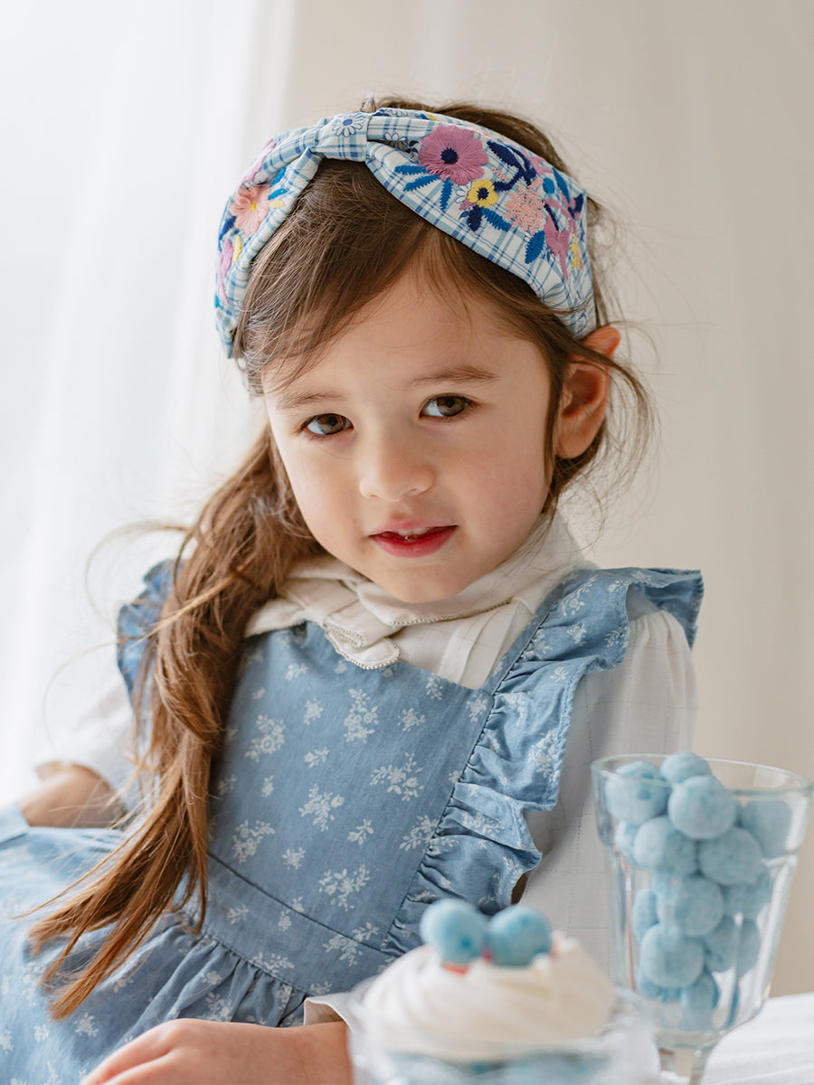 Stirnband mit handgefertigter Stickerei, blau kariert