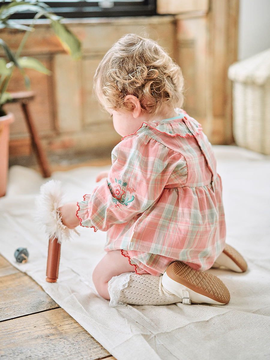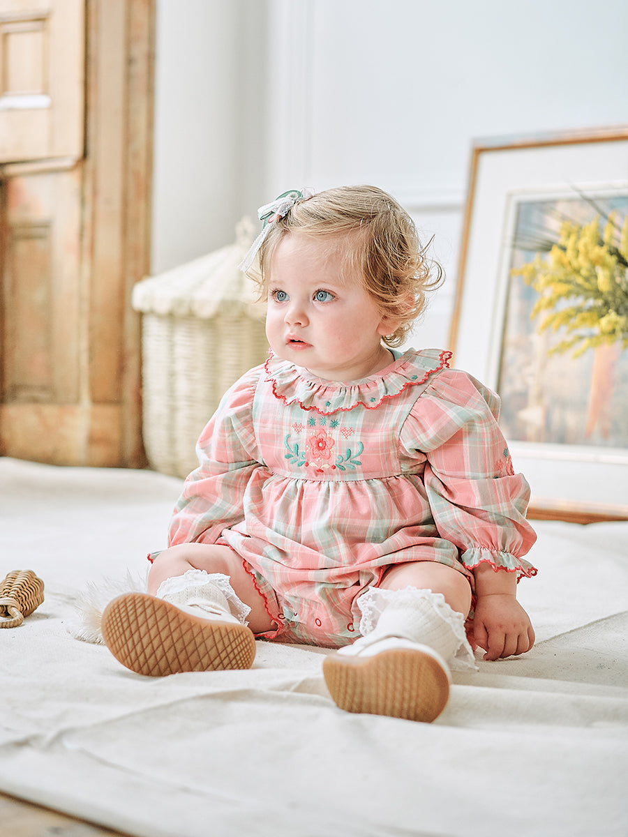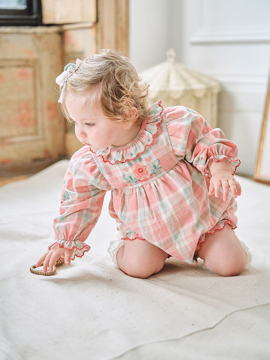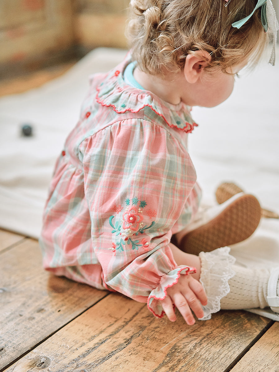 Luss Embroidered Romper, Green Check