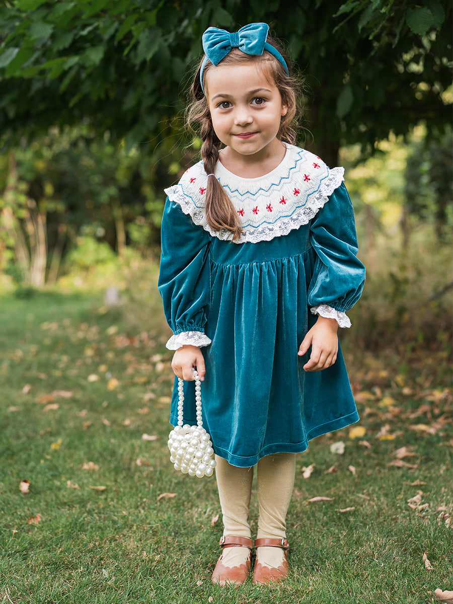 Bella Hand-Smocked Velvet Dress, Lake Green